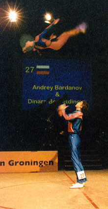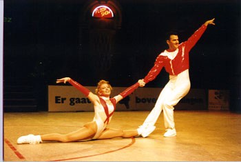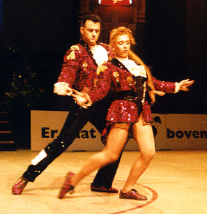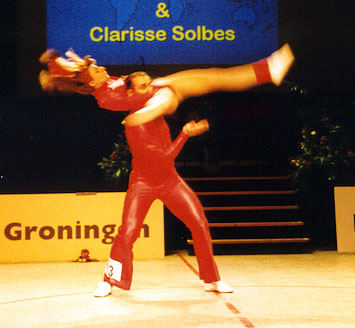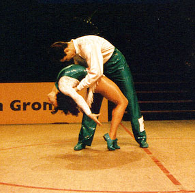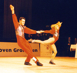 "We improved from competition to competition"Beate Wolf said at the press-conference immediately after the show, "and the audiance did the same. It was fantastic to be dancing here!" And Beate and Andreas gave a fantastic performance. They made the first place in dancing-technique, the part they are known to be very strong in, leaving rank 2 and 3 for Mónica Martínez/David Felip and Clarisse Solbes/Mickael Angueira. So they were the last couple to dance in the acrobatic contest, and they danced with much power and without any mistakes! The audiance in the nearly sold-out Martinihal in Groningen was frenetic - and Beate and Andreas must have known that only something very unusual could now keep them from being the winners! So the results of the international jury left no doubt: Beate and Andreas Wolf are the Rock´n´Roll-World-Champions 1997! |