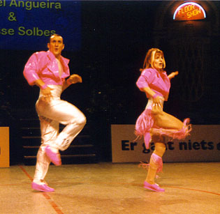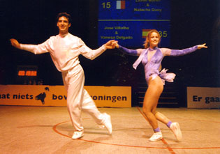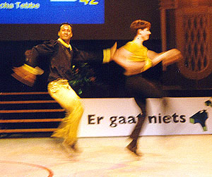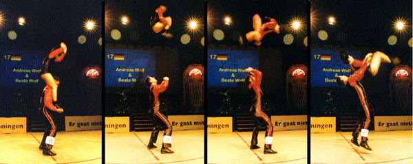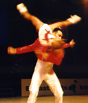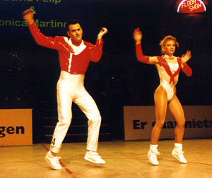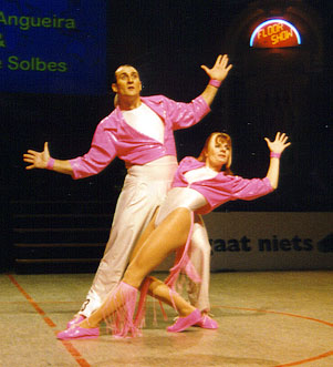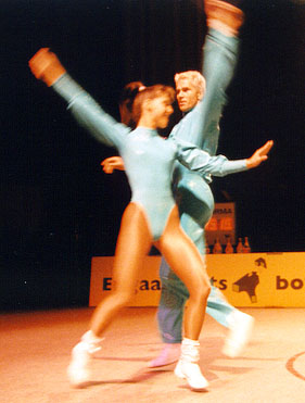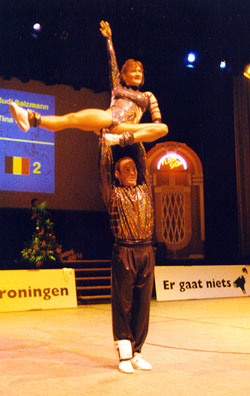 Fighting to the topBirgit Hartmann and Peter Fenkl from Germany are very good in the acrobatic contest, and this made it possible for them to reach the third place before Clarisse Solbes and Mickael Angueira from France. Before the acrobatic contest they held rank four, behind Solbes/Angueira, but their good acrobatic performance with many difficulties convinced the jury. The couple Mónica Martínez and David from Spain, who had won the european championship this year, made the second place. |
